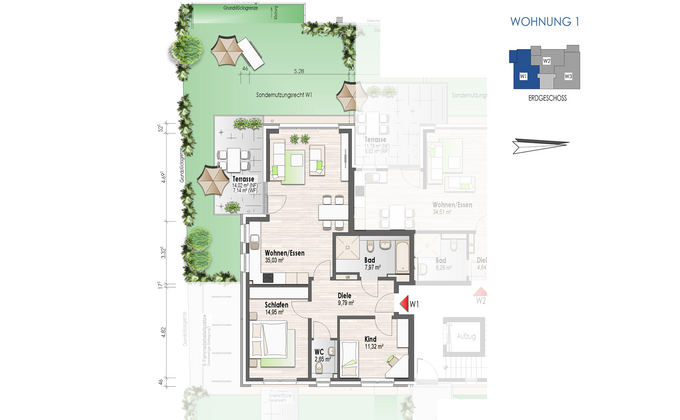 Zu Wohnung Nr.1 gehört eine Garage, die verbindlich zuzüglich zur Wohnung zu erwerben ist. Der Kaufpreis beträgt 14.900 € (inklusive Stromanschluss).